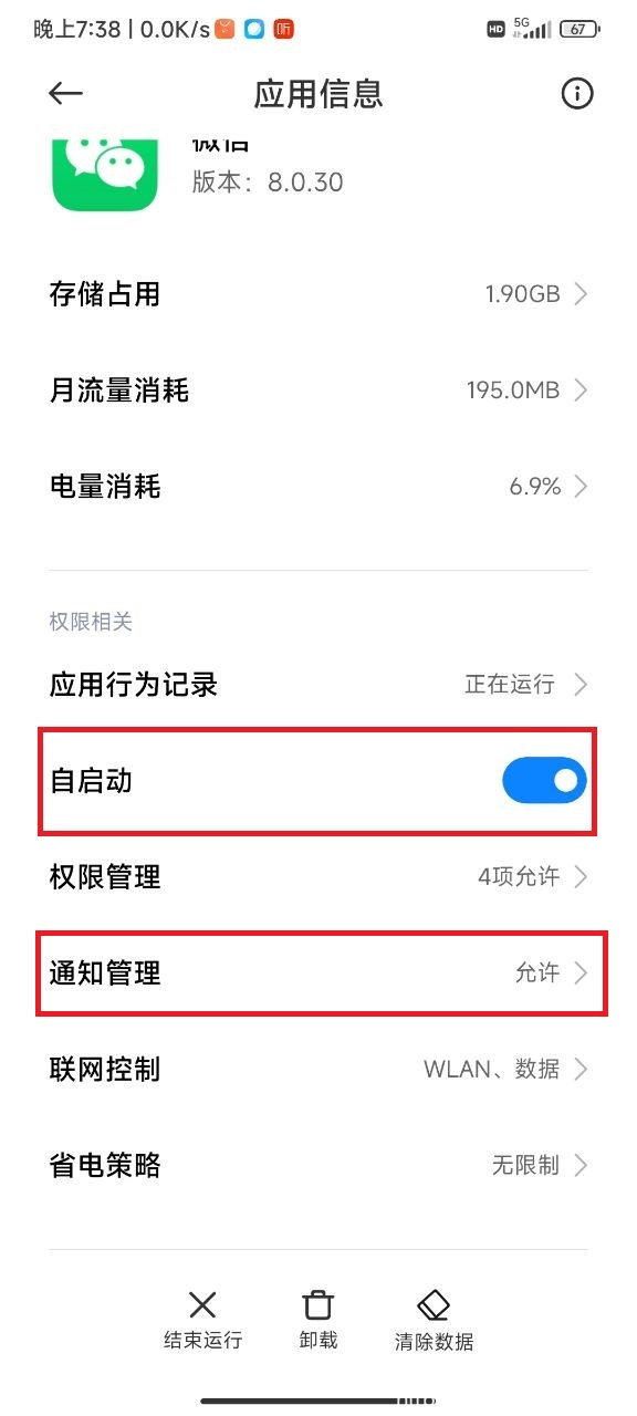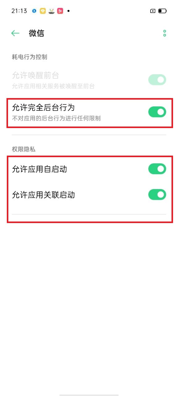 点击 设置-应用和服务-应用管理/应用启动管理-微信,按如下设置